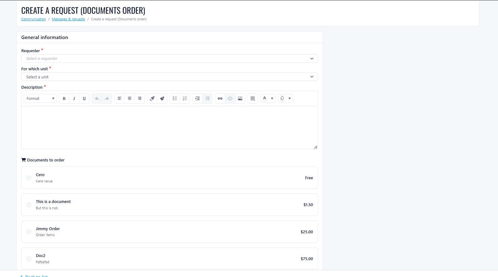 - Create and manage documents available for order