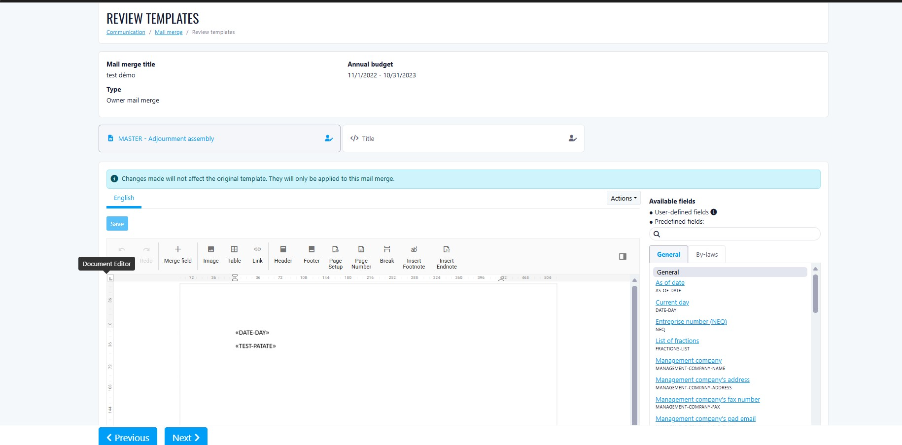Mail Merge Template Editing via Syncfusion DOCX Editor