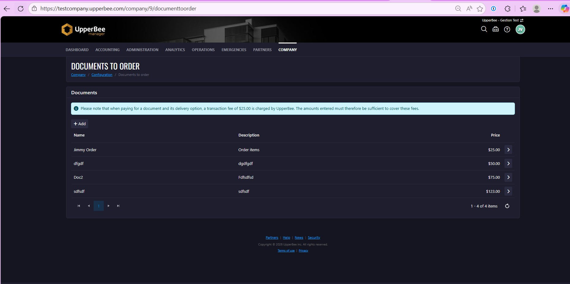 - Documents and pricing are created at the company level in Document Orders.