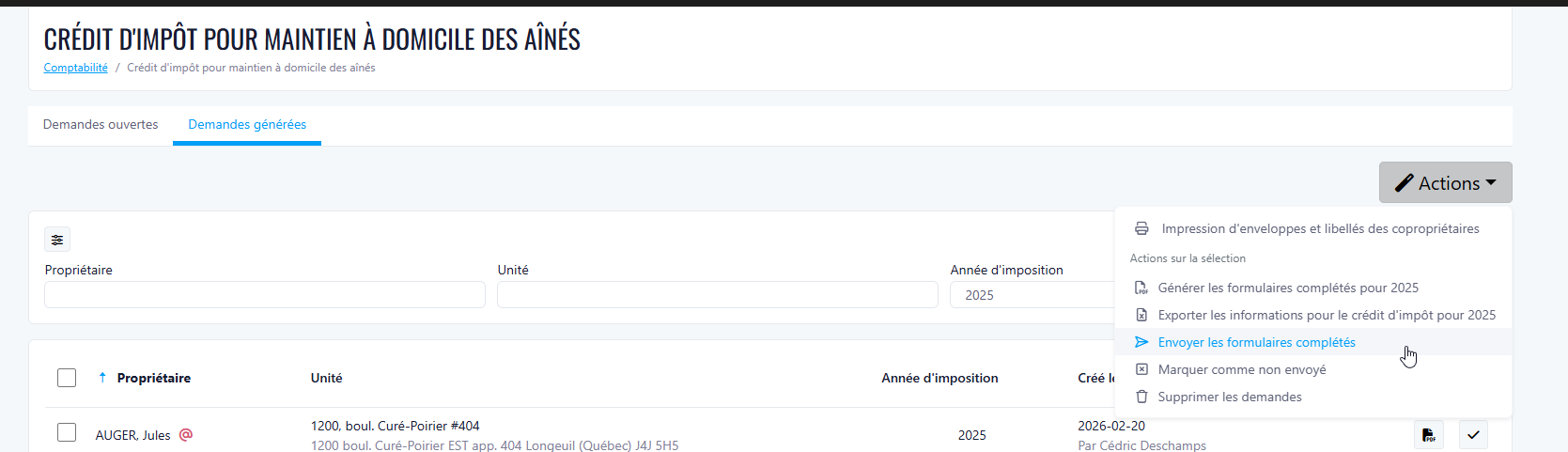 Les gestionnaires d’immeubles peuvent désormais suivre les formulaires de crédit d’impôt liés aux services de soutien à domicile au niveau de l’immeuble, ce qui facilite la gestion de la conformité et de l’historique d’une année à l’autre.